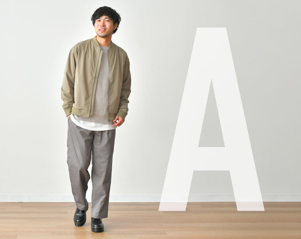 上半身は細身、下半身はワイドパンツのようなある程度、太さのあるアイテムで作るのが「Aラインシルエット」 。