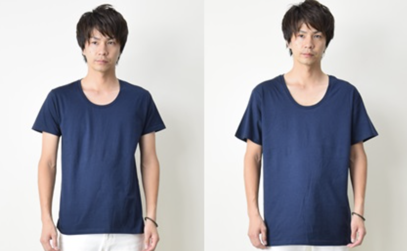 同じ洋服でも「サイズ」だけでかなり印象が違います。 (左はジャストサイズ・右は大きめ)特に痩せ型の男性は首元がダボっと開いていると「細さ」が目立ってしまいます。