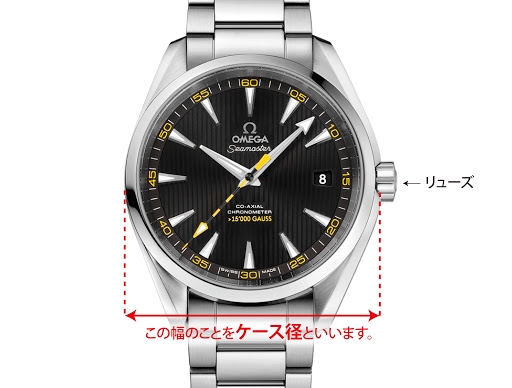 ケースサイズとは、ケースの直径のことを表しています。上の画像のように縦ではなく横の幅のことを「ケース径」と言い、リューズを含めない横幅がケースサイズです。 ケースサイズの大きさが大きいと、腕時計の迫力に腕が負けてしまい不恰好や腕が頼りなく映ってしまうのです。 なので腕が細くて「腕時計が似合わない」と思われたくない人はケースサイズが大きめの時計は避けましょう!
